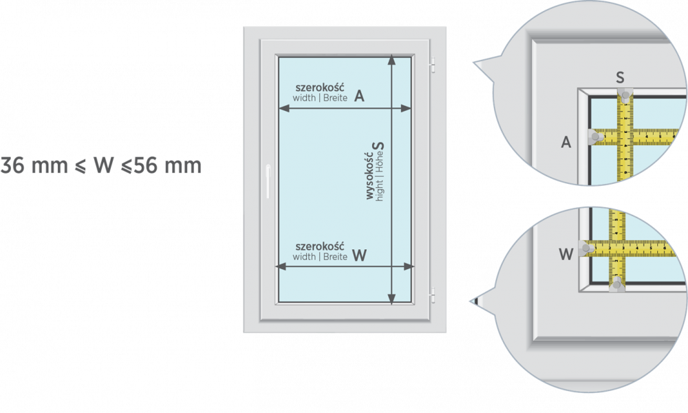 A – szerokość szyby wraz z uszczelkami (pomiar szerokości wykonać w 3 miejscach według instrukcji pomiaru i w tabeli podać najmniejszy)